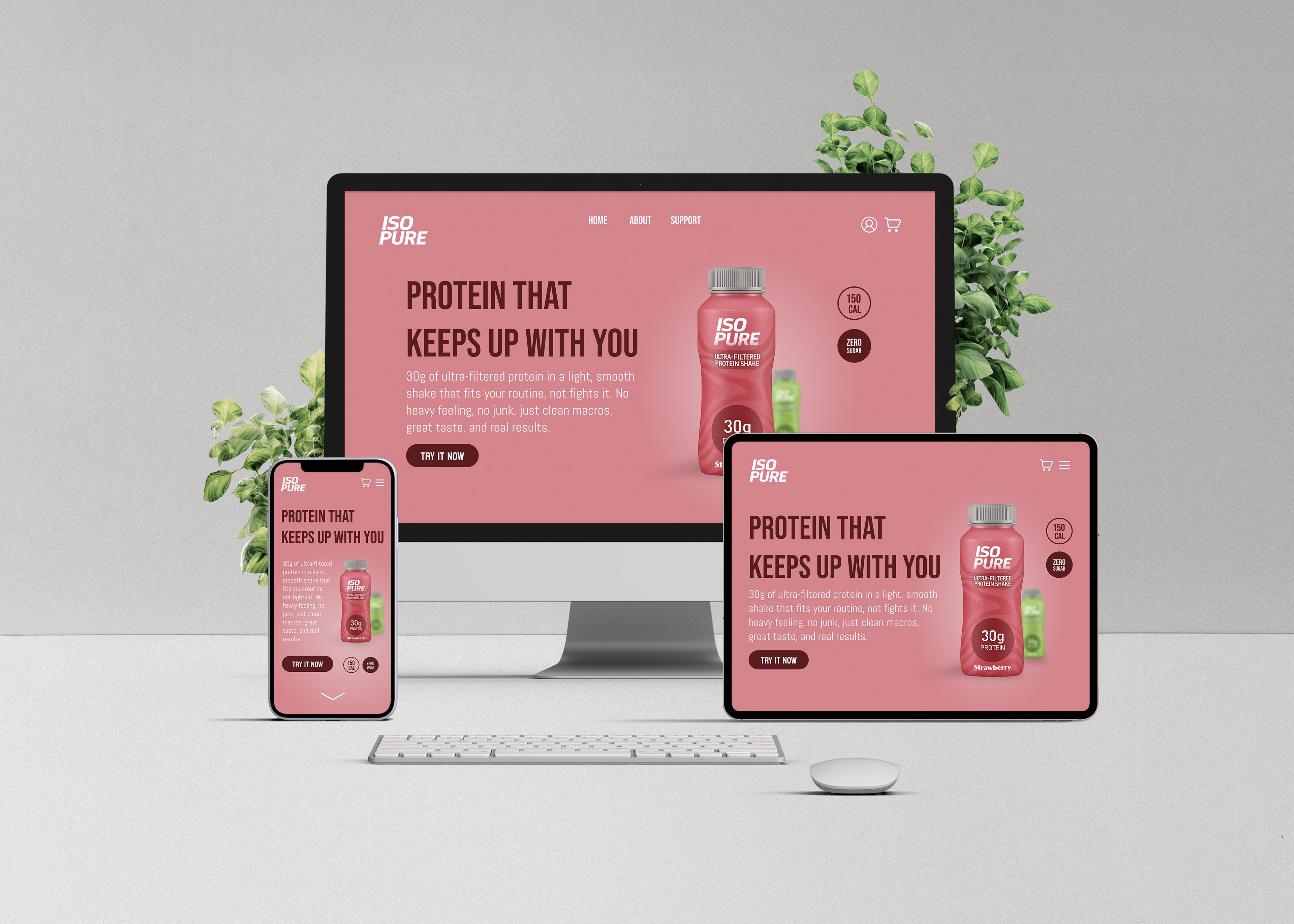 The visual system draws from ISOPURE’s core brand promise, transparency and purity, using clean spacing, minimal color accents, and direct information hierarchy to reinforce that message across devices.